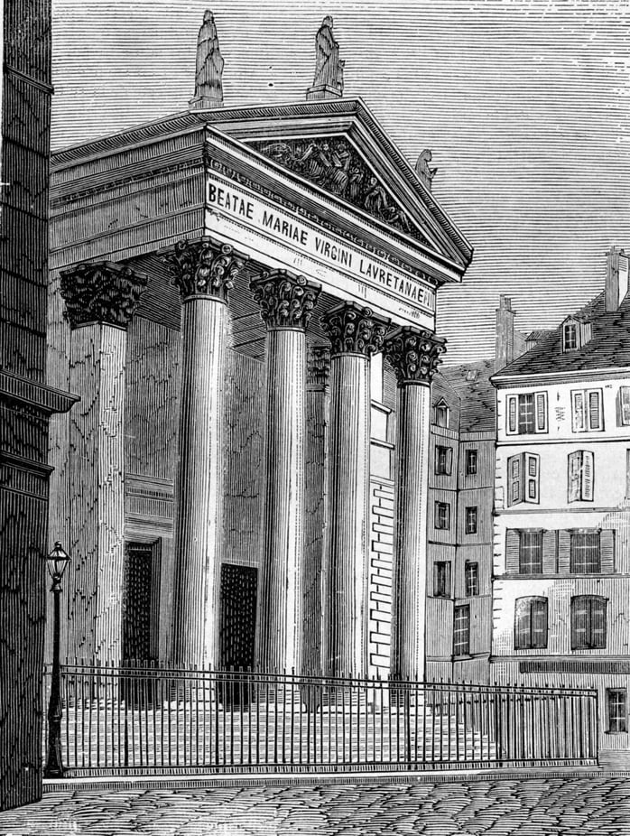 La première pierre de la nouvelle église Notre-Dame-de-Lorette a été posée le jour de la Saint-Louis, 25 août 1823. L’architecte, Louis-Hippolyte Lebas, neveu de Vaudoyer, avait prévu au maximum trois ou quatre ans de travaux ; mais il fallut finalement treize ans pour mener à bien ce chantier au cœur du quartier de la finance, des arts et des lettres, surnommé très justement « La nouvelle Athènes » ! A quelques dizaines de mètres, on pouvait y trouver par exemple le Square d’Orléans, où résidaient au milieu d’ateliers d’artistes Chopin, George Sand, Zimmermann, Alkan, Marmontel, Alexandre Dumas père. L’église elle-même, construite dans le plan basilical romain, allait être entièrement décorée par les meilleurs artistes du temps : on peut citer le sculpteur Jean-Jacques Elshoecht, les peintres Henri-Alphonse Perin, François-Joseph Heim (auteur de la Bataille de Rocroi), Adolphe Roger, Victor Orsel, François-Louis de Juinne.